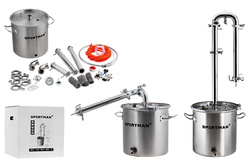 - Комплектация Перегонный бак Кран для слива барды с прокладкой и контргайкой Крышка к перегонному баку с клампом 1,5” Уплотнительная силиконовая прокладка для соединения перегонного бака и крышки Хомут для соединения перегонного бака и крышки Дивертор Царга 1,5” высотой 35 см Дефлегматор 1,5” высотой 35 см – «Холодильник» Отвод 1,5” на 90 градусов Отвод 1,5” на 90 градусов со штуцером для термометра Дефлегматор 1,5” высотой 17,5 см – «Предохладитель» Хомут для кламп-соединения 1,5”– 6 шт Прокладка для кламп-соединения 1,5” – 6 шт Шланг для подвода \ отвода воды длинной 6 м Разделитель для подвода воды Электронный термометр Насадка Панченкова – 3 шт Игольчатый кран – 2 шт Лента ФУМ Колпачок для выхода готового продукта Трубка из пищевого силикона для выхода готового продукта – 0,8 м Аварийный клапаном сброса давления Биметалический термометр Гильза для биметалического термометра