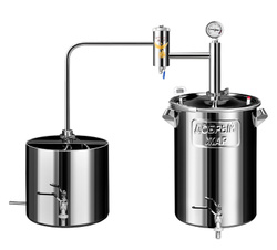 • Комплектация • Дистиллятор • Холодильник • Кламп Ø 1,5" 2 шт. • Прокладка силиконовая Ø 1,5" 2 шт. • Термометр цифровой • Спиртомер • Хмельные дрожжи 100 гр. • Кран для слива барды на кубах от 20 литров • Книга с рецептами • Фирменная коробка