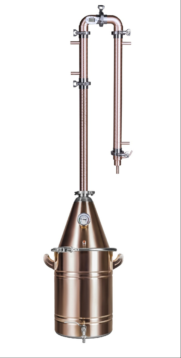 • Комплектация • Перегонный куб 1 шт. • Соединительный хомут (для бака) 1 шт. • Силиконовая прокладка для конуса 1 шт. • Подрывной клапан 1 шт. • Конус с фланцем 1 шт. • Царга 50 см 1 шт. • Силиконовая прокладка под кламп 6 шт. • Соединительный кламп 6 шт. • Холодильник трубчатый 1 шт. • Дефлегматор трубчатый 1 шт. • Шланг 7 м. • Переходник 1 шт. • Тройник 2 шт. • Игольчатый кран 1 шт. • Спиртовые дрожжи 100 гр.1 шт. • Ареометр: 0-40, 40-70, 70-100. • Регулярная насадка Панченкова (медь) 3 шт. • Термометр цифровой 1 шт. • Термометр биметаллический 1 шт. • Книга с рецептами, паспорт, гарантийный талон 1 шт. • Коробка 1 шт.