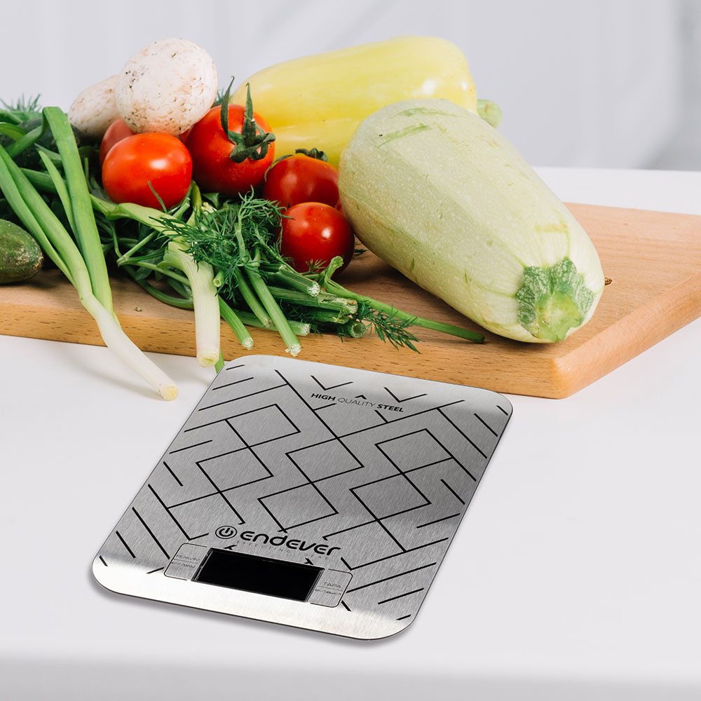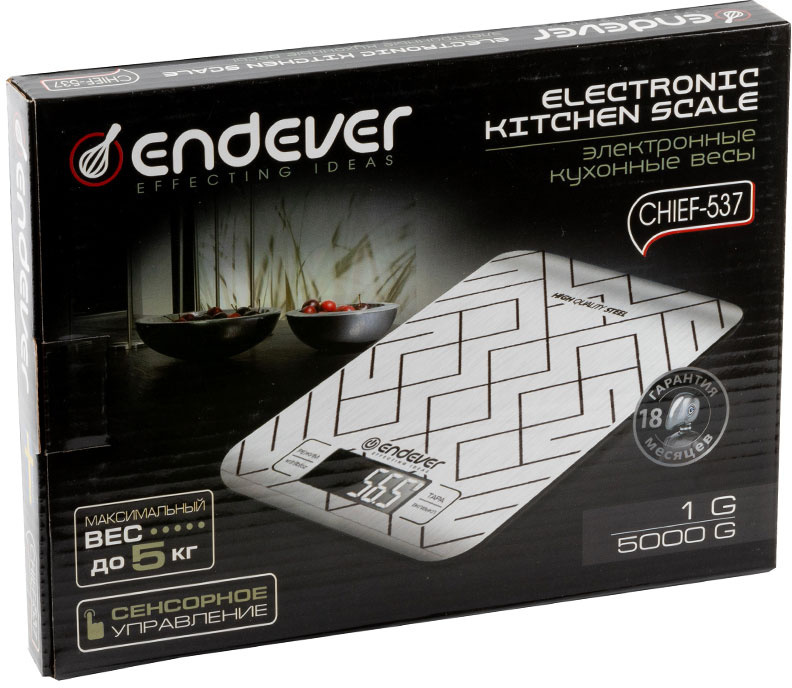 • Функции Сброс веса тары, Автоматическое выключение, Индикатор разряженной батарейки, Изменение объема, Сенсорное управление