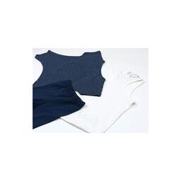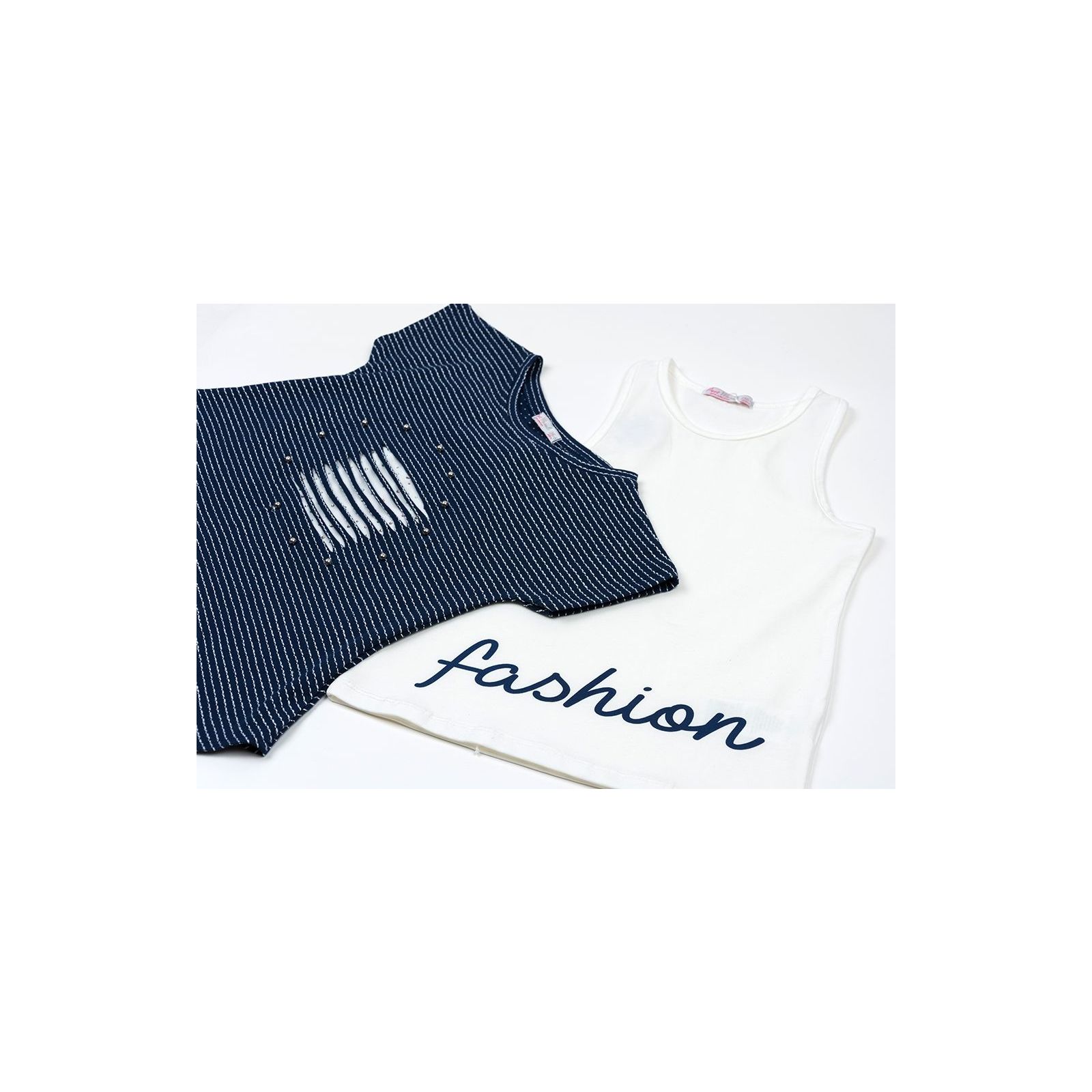 • Майка - подовжена, приємного молочного кольору, спинка - борцовка, не надто вузька. Пройми і горловина оброблені еластичною бейкою з такого ж трикотажу. Трикотаж тонкий, м'який, приємний на дотик. Внизу прикрашена написом «fashion».