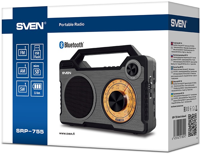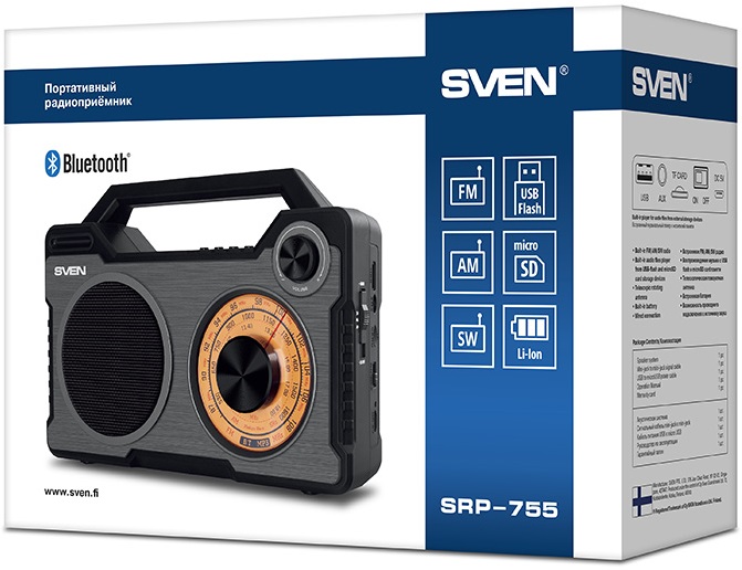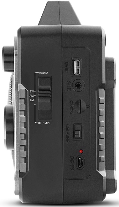 Портативный; аналоговый тюнер; FM, AM; USB-порт, слот для карт памяти, линейный вход, Bluetooth; вес 1000 г.