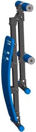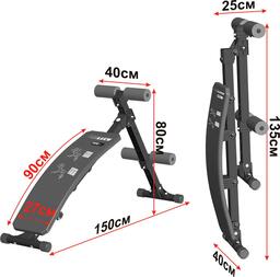 Изогнутая скамья для пресса. Максимальный вес пользователя: 140 кг. 4 варианта угла наклона: 15, 22, 35, 40°. 2 пары упорных валиков. На сидении указаны упражнения и тренируемые группы мышц. Может комплектоваться электронным тренером (опция). Складная конструкция. Размеры в собранном виде: 150x40x80 см. Размеры в сложенном виде: 40x25x135 см.