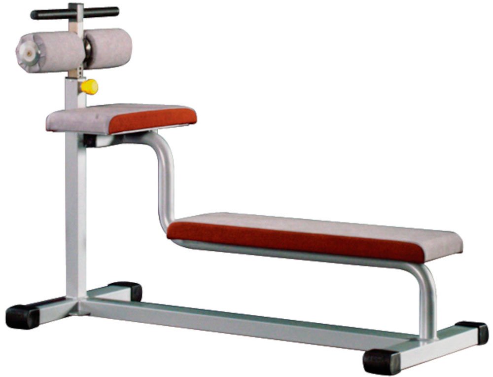 Скамья для тренировки мышц пресса. Регулируемая высота фиксирующих валиков. Нескользящий упор для рук. Рама из стального профиля без изменения поперечного сечения. Минимум сварных швов. Регулировочные детали из пластика заметного желтого цвета. Размеры: 130x62x116 см. Вес: 64 кг.