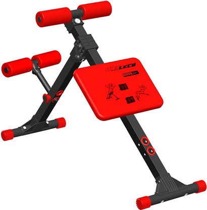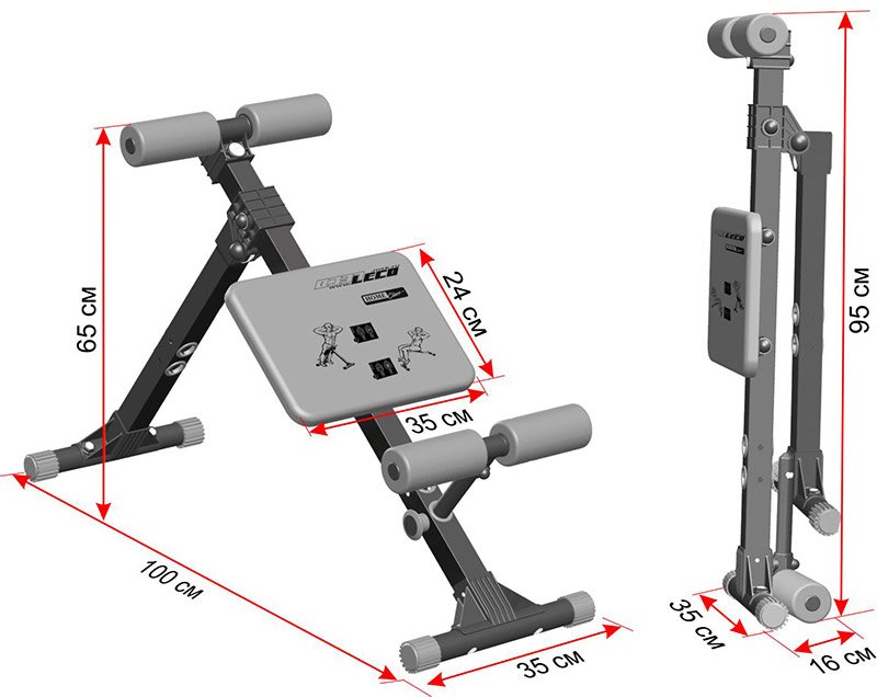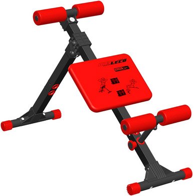 Универсальная скамья для пресса и мышц спины. Максимальный вес пользователя: 120 кг. Угол наклона: 42°. 2 пары упорных валиков. Переставляемая пара валиков. Принт на обивке с указаниями основных упражнений и тренируемых групп мышц. Складная конструкция. Размеры в собранном виде: 100x35x65 см. Размеры в сложенном виде: 35x16x95 см.