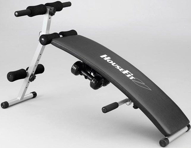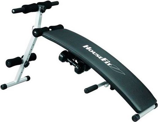 Скамья для выполнения силовых упражнений и тренировки пресса. Изогнутая спинка с регулируемым углом наклона. Большие мягкие грифы с комфортабельными подушками. Максимальный вес пользователя: 120 кг. Прочная стальная конструкция из профилей 5х5 см. Антистатическое эмалевое покрытие. Складная модель. Размеры: 125х56х62 см. Вес: 16 кг. В комплекте: 2 гантели весом по 1.5 кг.