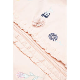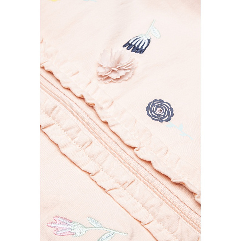 Стильный жакет с удобной застежкой-молнией и карманами. Украшен декоративными цветами и ярким принтом. Карманы, застежка и воротничок обрамлены рюшем. Манжеты - на широкой эластичной резинке. Жакет выполнен из неаллергенного материала, приятного на ощупь.