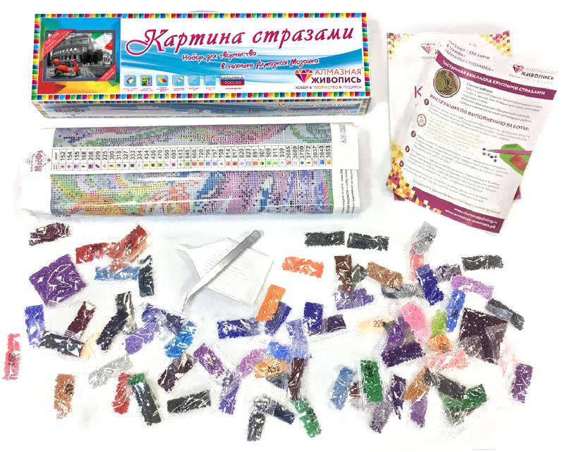 - Комплектация набора пинцет, полотно-схема с клеевой основой, набор страз, инструкция, лоток для страз
