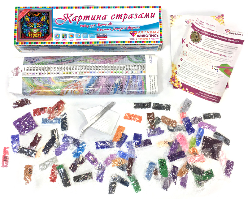 - Комплектация набора пинцет, полотно-схема с клеевой основой, набор страз, инструкция, лоток для страз