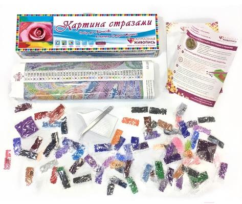 - Комплектация набора пинцет, полотно-схема с клеевой основой, набор страз, инструкция, лоток для страз