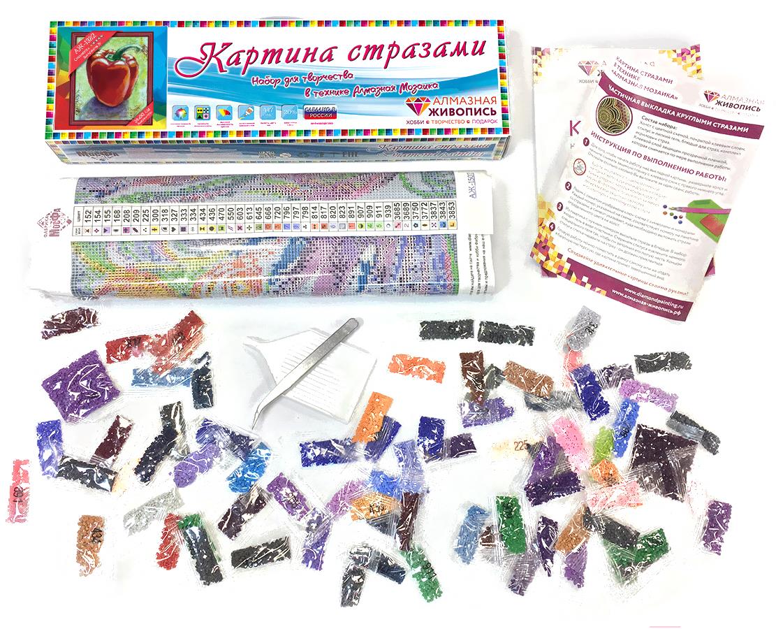 - Комплектация набора полотно-схема с клеевым слоем с условными обозначениями, инструкция, пластиковое блюдце, пинцет, упакованные стразы