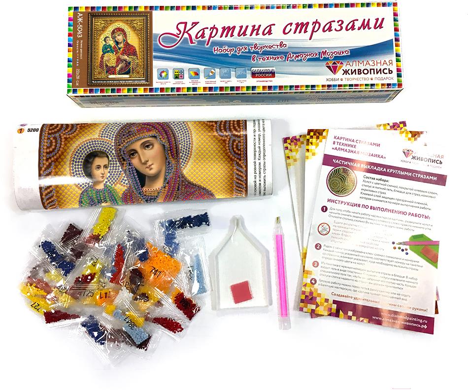 - Комплектация набора полотно-схема с клеевым слоем с условными обозначениями, инструкция, пластиковое блюдце, пинцет, упакованные стразы