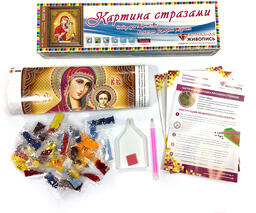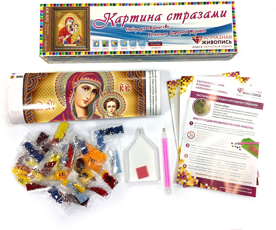 - Комплектация набора пинцет, полотно-схема с клеевой основой, набор страз, инструкция, лоток для страз