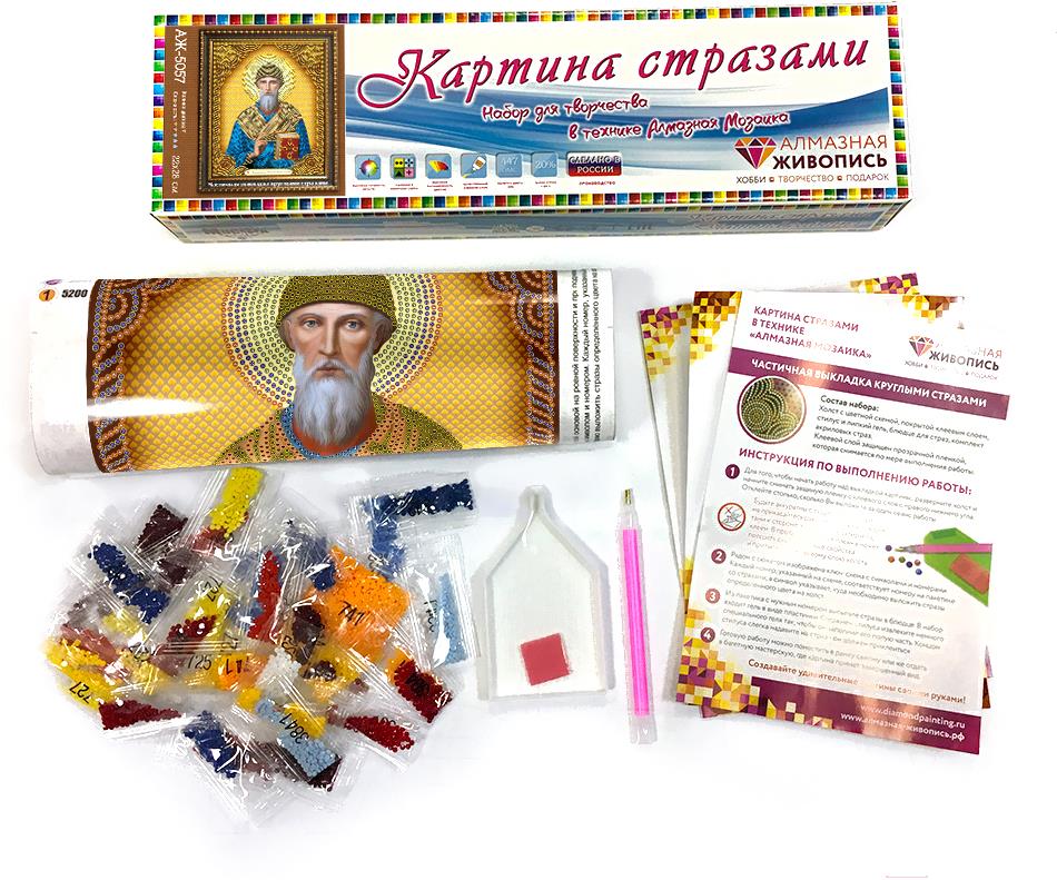 - Комплектация набора полотно-схема с клеевым слоем с условными обозначениями, инструкция, пластиковое блюдце, пинцет, упакованные стразы