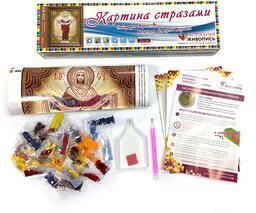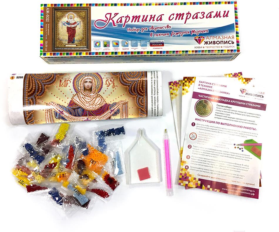 - Комплектация набора полотно-схема с клеевым слоем с условными обозначениями, инструкция, пластиковое блюдце, пинцет, упакованные стразы