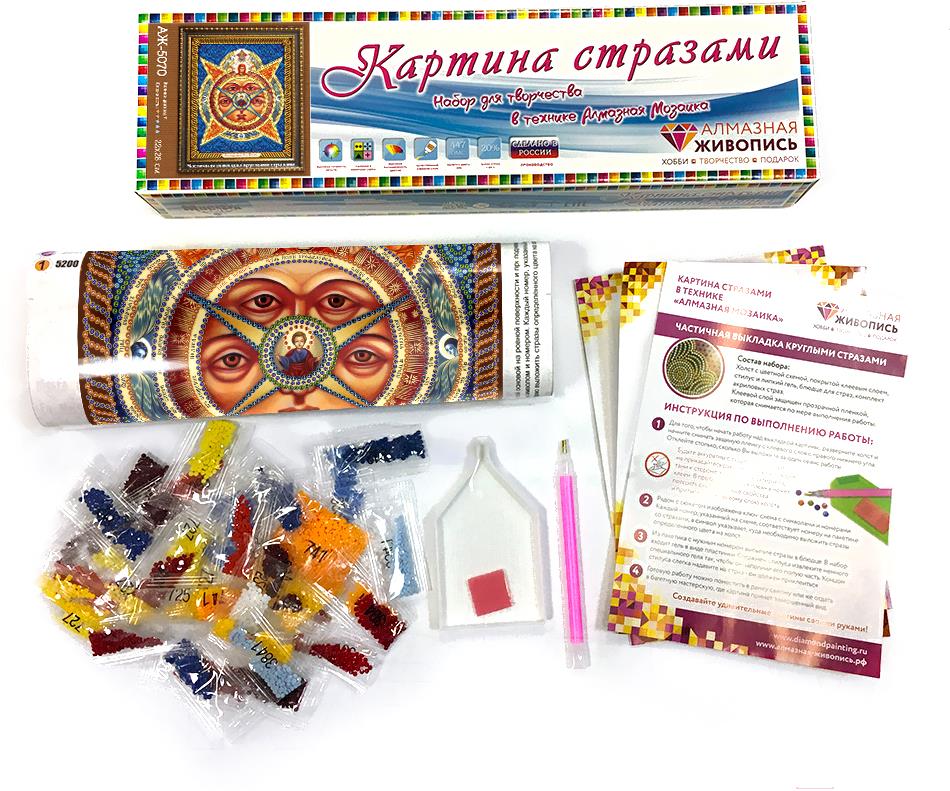 - Комплектация набора полотно-схема с клеевым слоем с условными обозначениями, инструкция, пластиковое блюдце, пинцет, упакованные стразы
