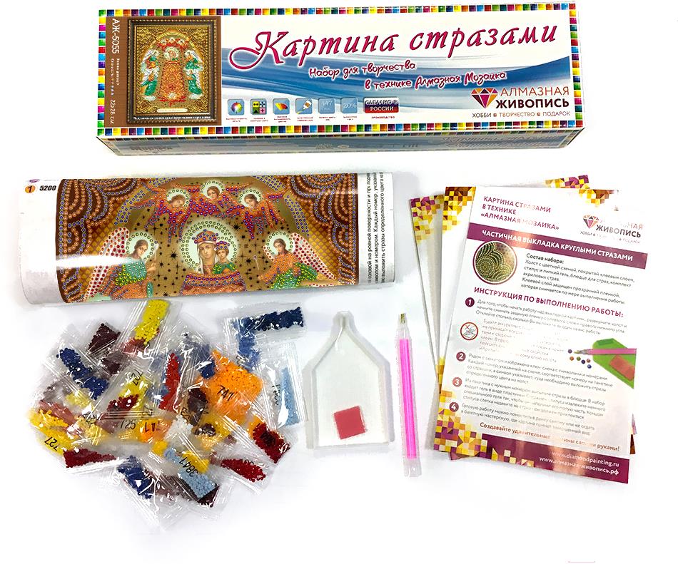 - Комплектация набора пинцет, полотно-схема с клеевой основой, набор страз, инструкция, лоток для страз