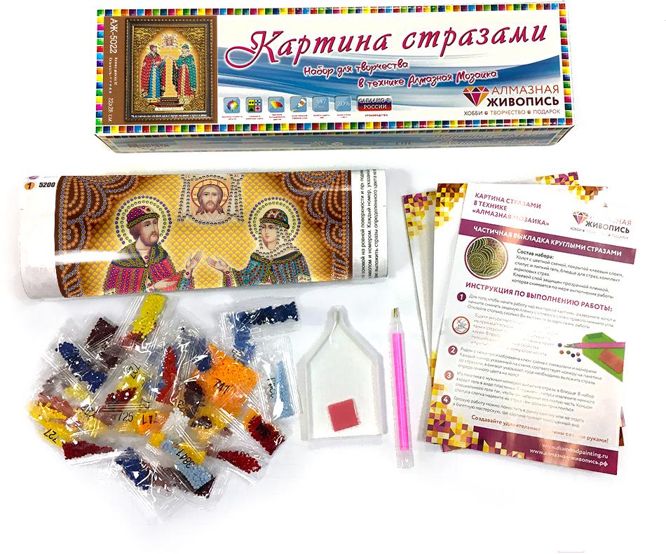 - Комплектация набора пинцет, полотно-схема с клеевой основой, набор страз, инструкция, лоток для страз