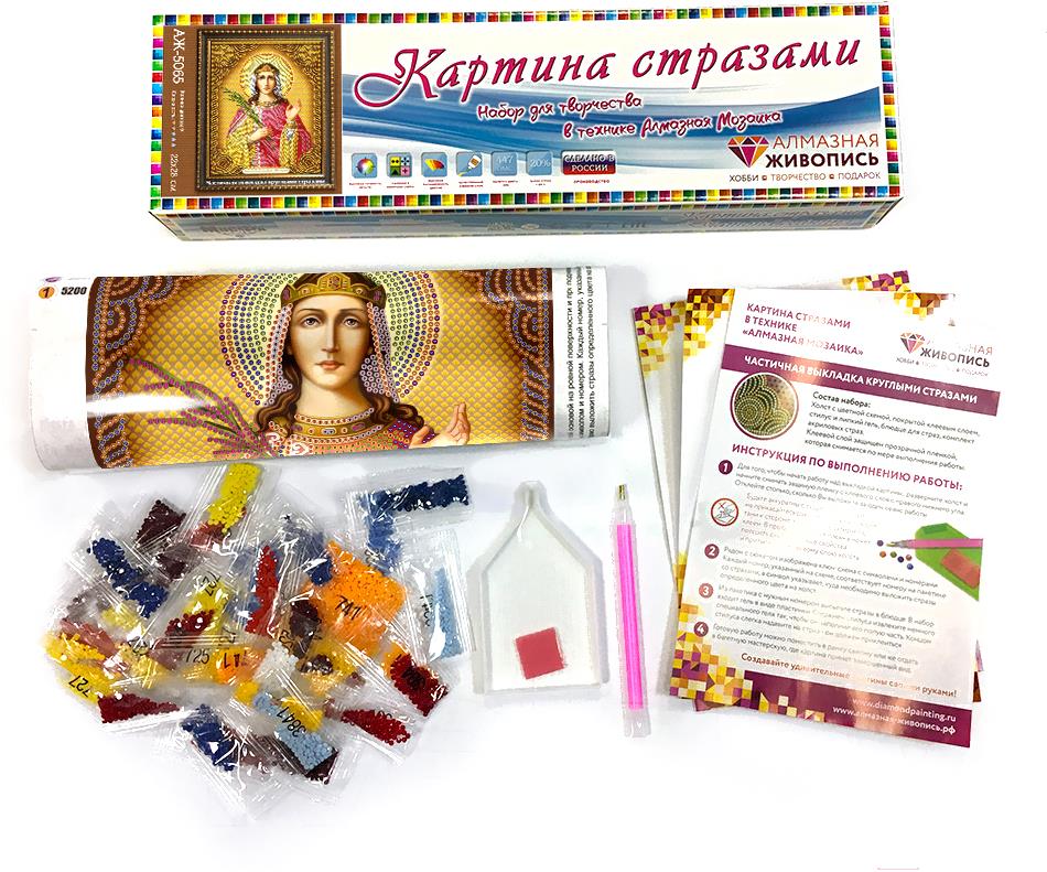 - Комплектация набора пинцет, полотно-схема с клеевой основой, набор страз, инструкция, лоток для страз