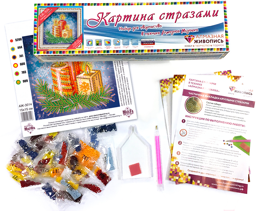 - Комплектация набора пинцет, полотно-схема с клеевой основой, набор страз, инструкция, лоток для страз
