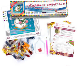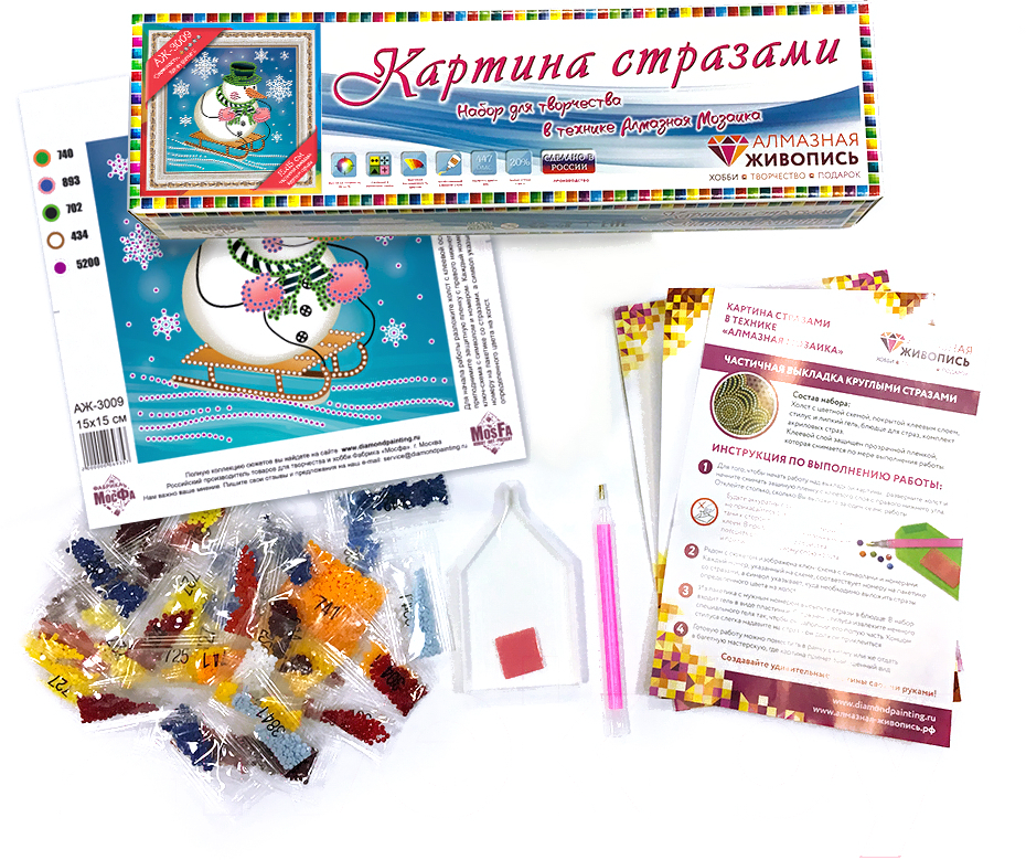 - Комплектация набора пинцет, полотно-схема с клеевой основой, набор страз, инструкция, лоток для страз