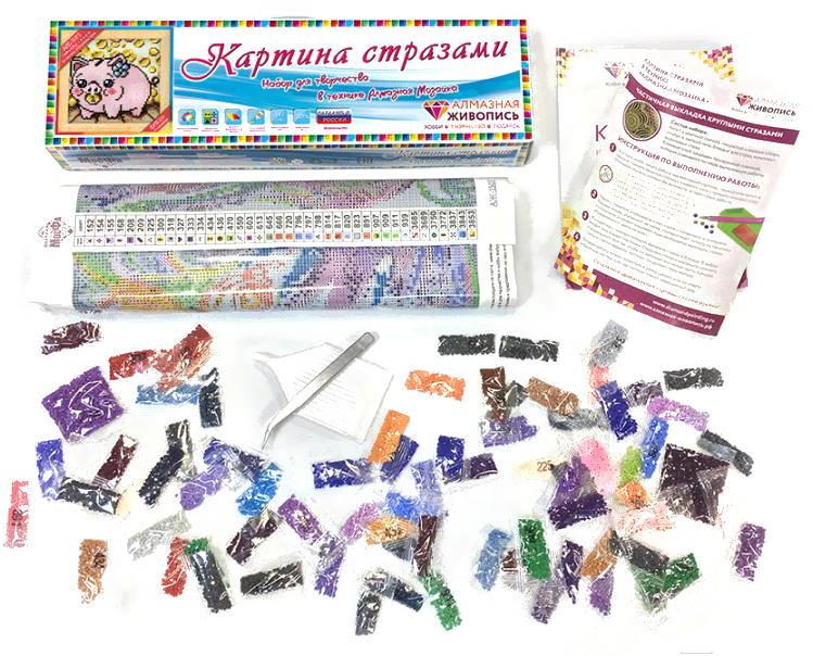 - Комплектация набора пинцет, полотно-схема с клеевой основой, набор страз, инструкция, лоток для страз