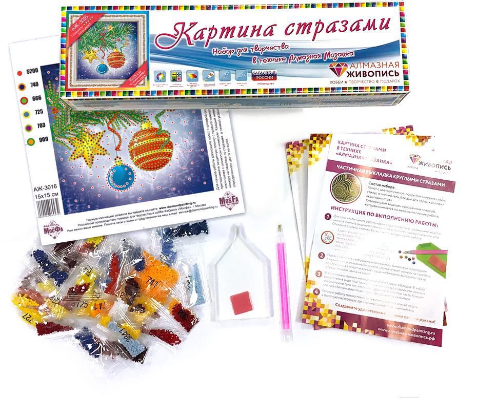 - Комплектация набора пинцет, полотно-схема с клеевой основой, набор страз, инструкция, лоток для страз