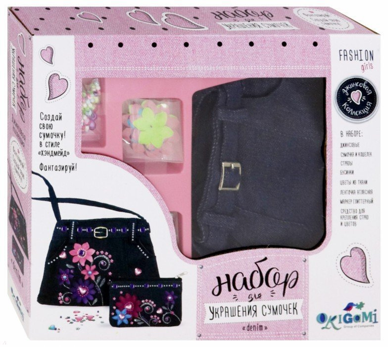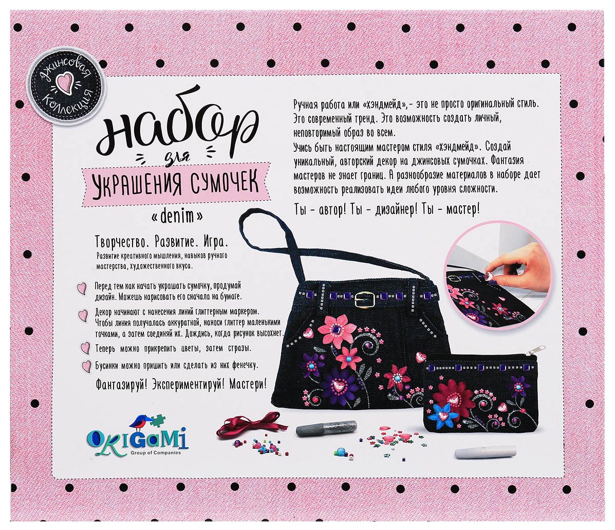 - Комплектация джинсовые сумочка и кошелек, стразы, бусинки, цветы из ткани, ленточка атласная, маркер глиттерный, средство для крепления страз и цветов.