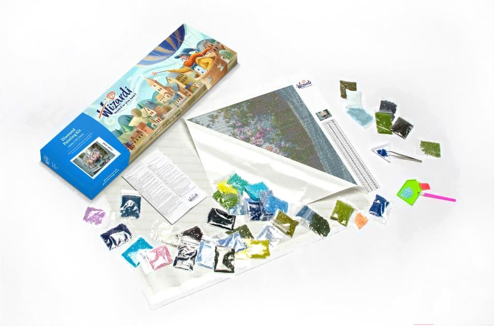 • Комплектация набора клей (сухой), пинцет, набор страз, лоток для страз (2 шт), стилус, холст с клеевым слоем