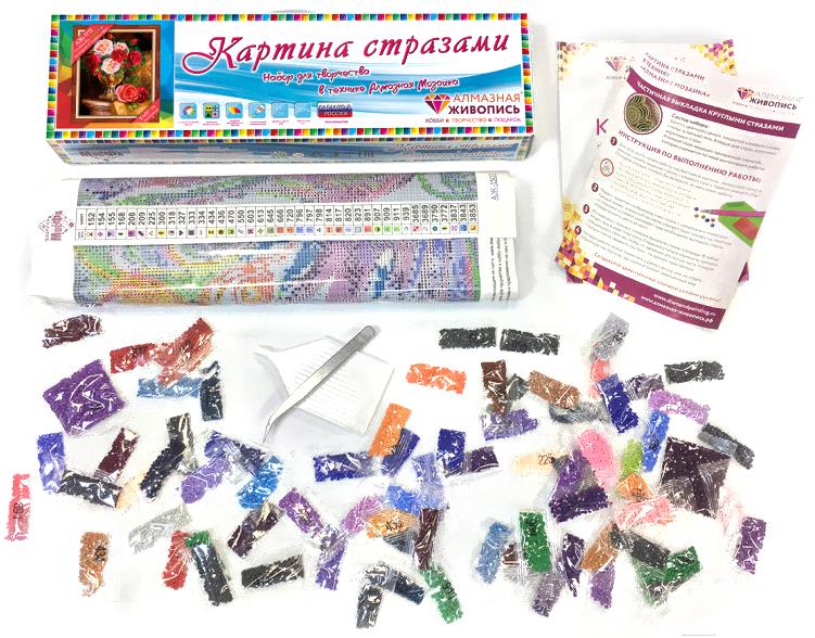 - Комплектация набора полотно-схема с клеевым слоем с условными обозначениями, инструкция, пластиковое блюдце, пинцет, упакованные стразы