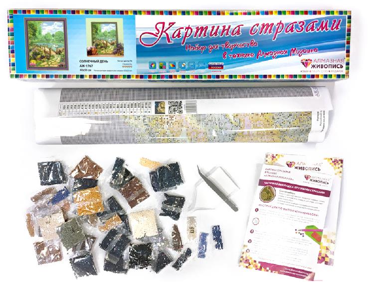 - Комплектация набора полотно-схема с клеевым слоем с условными обозначениями, инструкция, пластиковое блюдце, пинцет, упакованные стразы