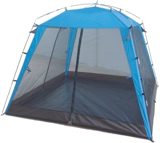 Закрытый кемпинговый тент. Материал: полиэстер 180T, 800 мм вод.ст. Дно: армированный полиэтилен с огнестойким покрытием. Каркас: стеклопластик 8.5 мм. 2 входа, москитные сетки со всех сторон, защитная юбка по периметру. Размеры: 210x210x150 см. Вес: 2.9 кг.