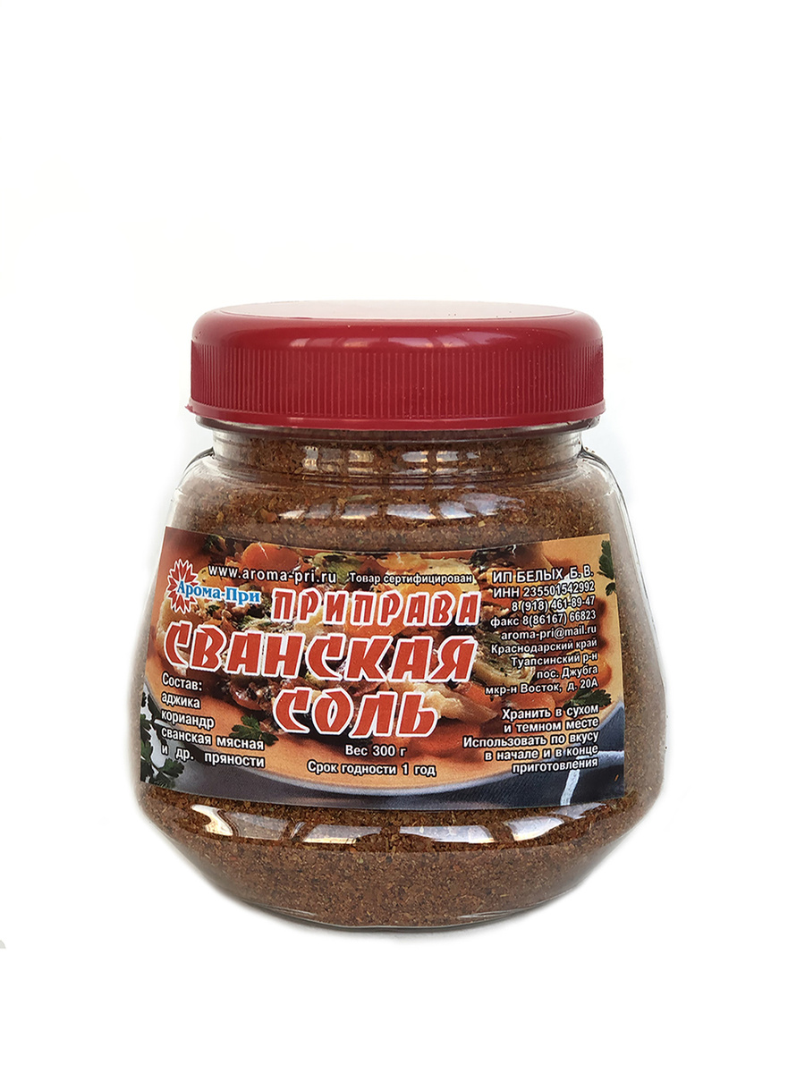 - Состав Сванская мясная, Аджика сухая и уцхо-сунели (голубой пажитник), 50% соли и 50% приправ и специй.