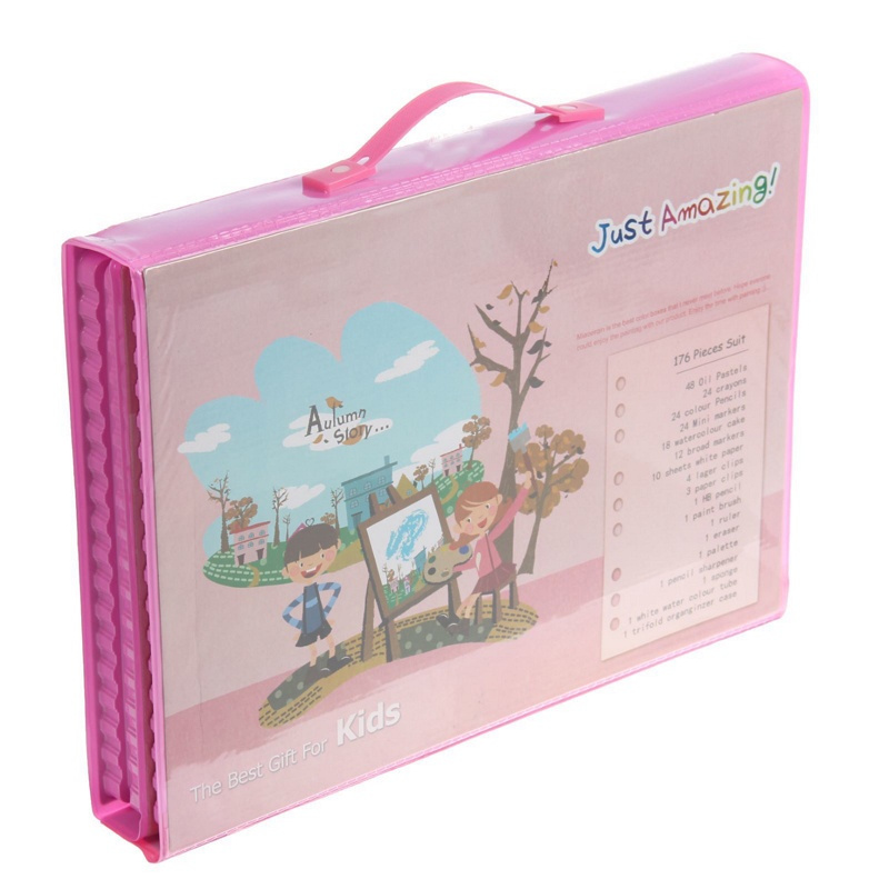 • Комплектация Цветные фломастеры для рисования маленькие 24 штуки, Цветные фломастеры для рисования 12 штук, Цветные карандаши грифельные 24 штуки, Масляных мелков 48 штук Грифельных мелков 24 штуки Набор качественных акварельных красок из 18 штук, кисточка, Флакон клея Простой карандаш + точилка + ластик Линейка Губка Пенал - чемоданчик с ручкой