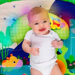 Развивающий коврик для детей с рождения. Съемный навес с огоньками, которые создают занимательное световое шоу для крохи. 4 подвесные игрушки: погремушка-слоник, бабочка с крыльями-прорезывателями, лягушка с разноцветными кольцами и большое безопасное зеркало. Воспроизведение мелодий и звуков природы на протяжении 20 мин.