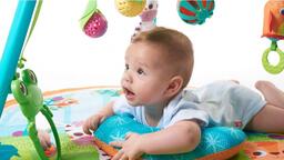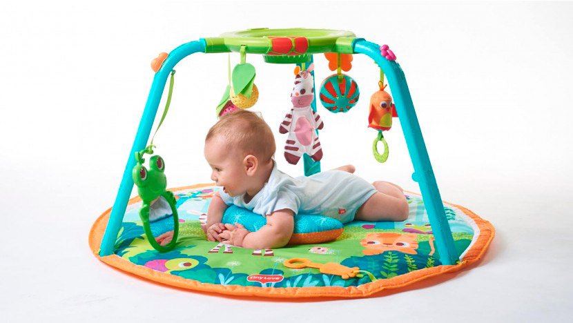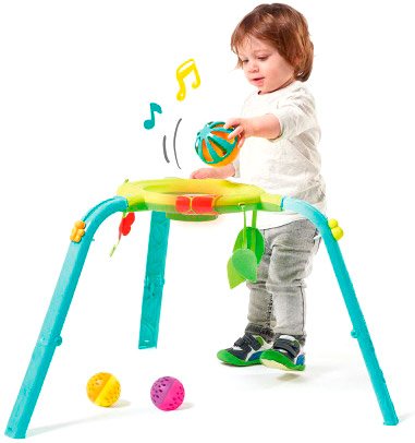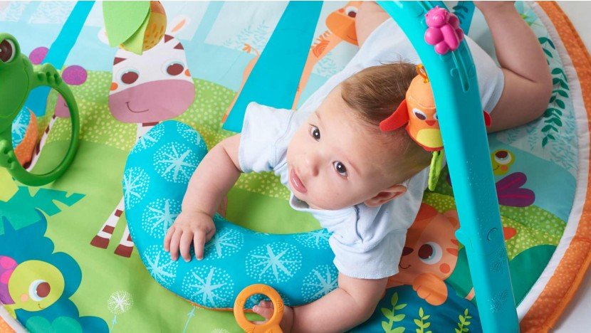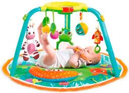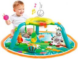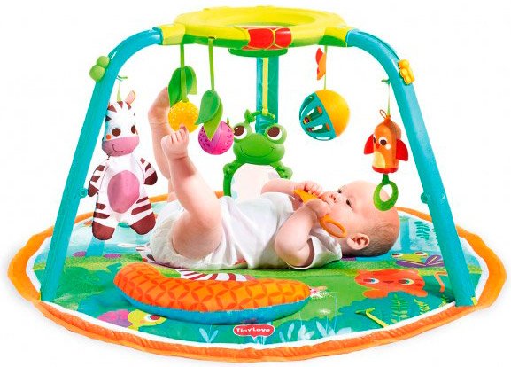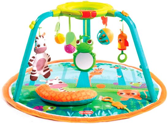 Игровой коврик для детей с рождения. Комплектуется аркой и развивающими игрушками. 15 увлекательных функций, включая музыкальную электронную игру с шариком, музыкальную подвеску в виде птицы, шуршащую зебру, мяч с шариками в виде тигра, зеркальце в виде лягушки и многое другое. 3 положения для разных возрастных периодов малыша: 0 м+ - игры на животике на специальной подушечке; 5 м+ - игры сидя; 12 м+ - игры стоя..