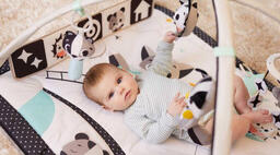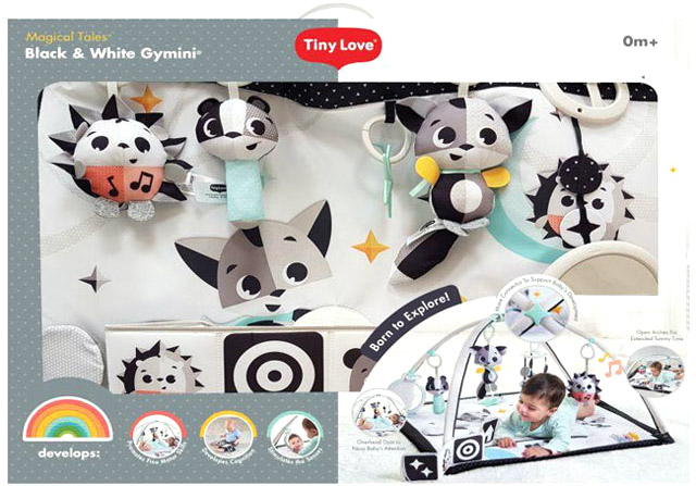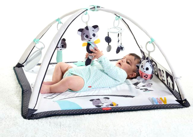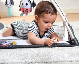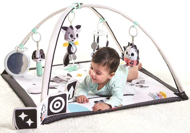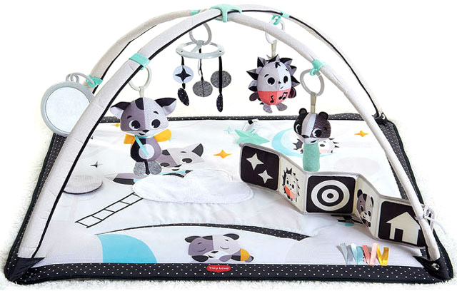 Развивающий коврик для детей с рождения. 2 регулируемые съемные дуги. 18 развивающих элементов на дугах и на поверхности коврика: мобиль в черно-белых тонах, колокольчик, плюшевое облако, шуршащий листочек с функцией игры в прятки, мягкая книжка, прорезыватели и пр. Музыкальная игрушка, которую может включить сам малыш (3 мелодии). Питание: 3 батарейки AAA (приобретаются дополнительно).