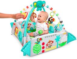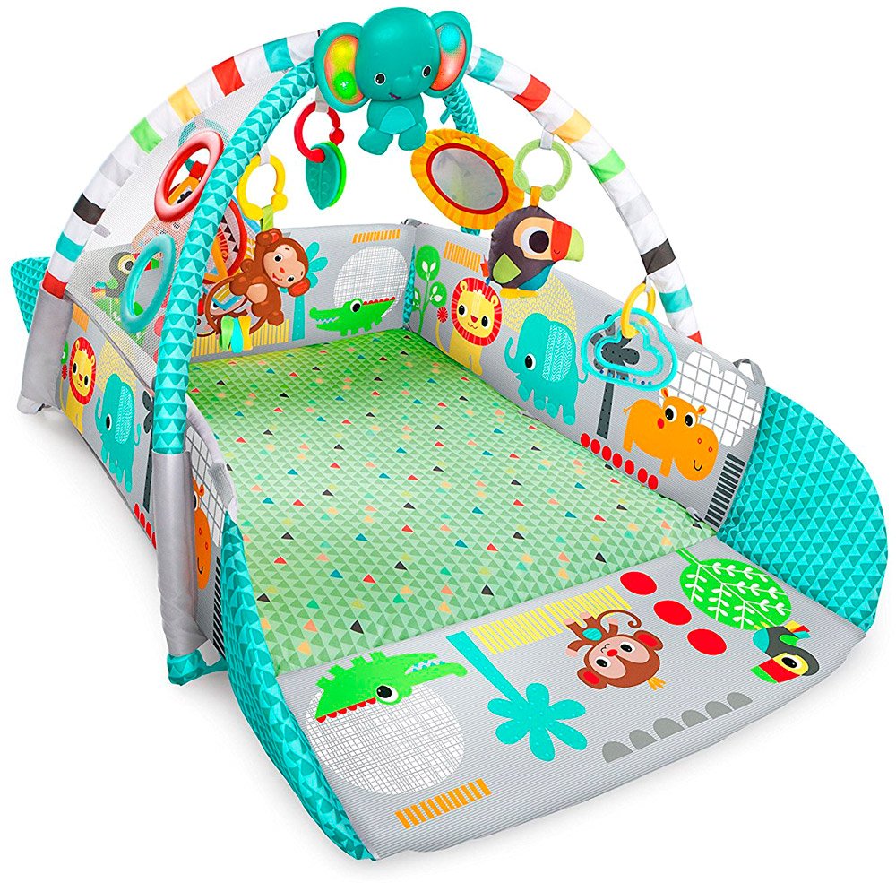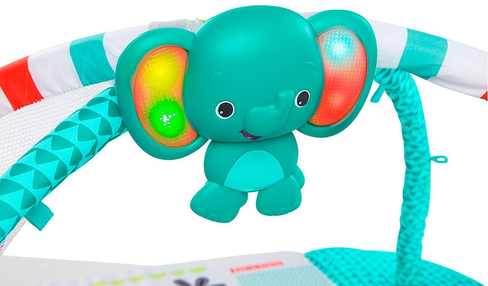 Развивающий коврик 5-в-1 для детей с рождения. Защитные бортики, которые можно трансформировать под потребности малыша. 2 съемные перекрестные дуги. Игрушки: слоник со световыми и звуковыми эффектами, тукан, обезьянка, безопасное зеркало, прорезыватели. Все игрушки съемные, их можно менять местами или использовать вне коврика.