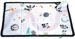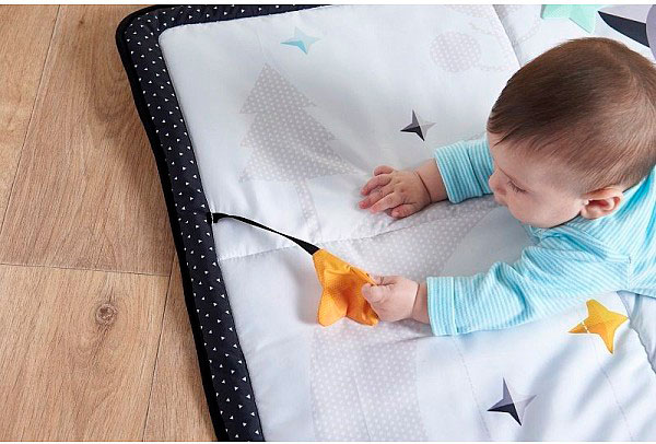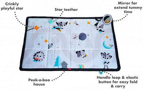 Развивающий коврик с рождения. Легко складывается - удобен для путешествий. Новый черно-белый дизайн - для развития зрения малышей с самого первого дня. Мягкая текстура. Что есть на поверхности коврика: элемент из войлока в виде домика с окошком, безопасное зеркальце, пуговица для игры и для легкого хранения коврика, шуршащий элемент в виде текстильной желтой звездочки на шнурке, пластиковый прорезыватель в виде бирюзовой звездочки на пластиковом кольце, перекидывающийся текстильный шуршащий листочек, текстильное облачко в виде аппликации из материала другой фактуры, сатиновые ленточки четырех цветов.