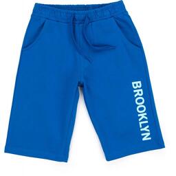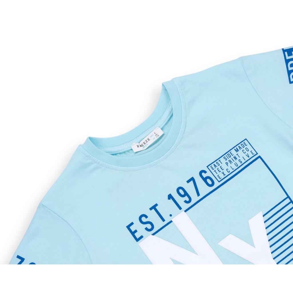 Ніжно-блакитного відтінку футболка прямого силуету з об'ємним принтом спереду. Горловина кругла, оброблена м'якою трикотажною резинкою. Шорти середньої довжини яскравого синього кольору з двома прорізними кишенями. Пояс еластичний на гумці з декоративним шнурком.