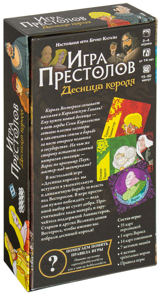 В настольной игре «Десница короля» вы вступите в увлекательную и динамичную борьбу за власть над Вестеросом. В игре престолов нужно побеждать - ведь иной выбор не сулит добра. Просчитывайте ходы наперед и заручайтесь поддержкой Ланнистеров, Старков и других Великих домов Вестероса, чтобы именно вас избрали десницей короля! Количество игроков: 2-4.