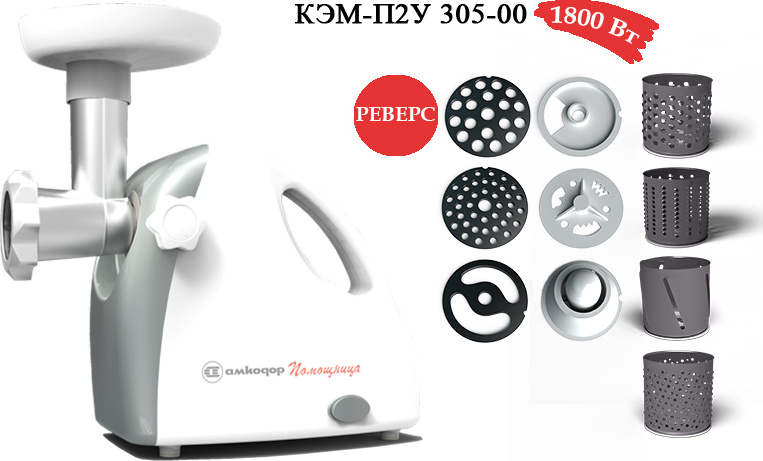 - Комплектация Насадка-мясорубка Количество сменных решеток 3 (крупная, мелкая, для «бефстроганов») Насадки для профилирования теста Насадка-шинковка Количество сменных барабанов 4 (для крупной, мелкой шинковки, для истирания картофеля, для нарезки ломтиками) Функция «Реверс»