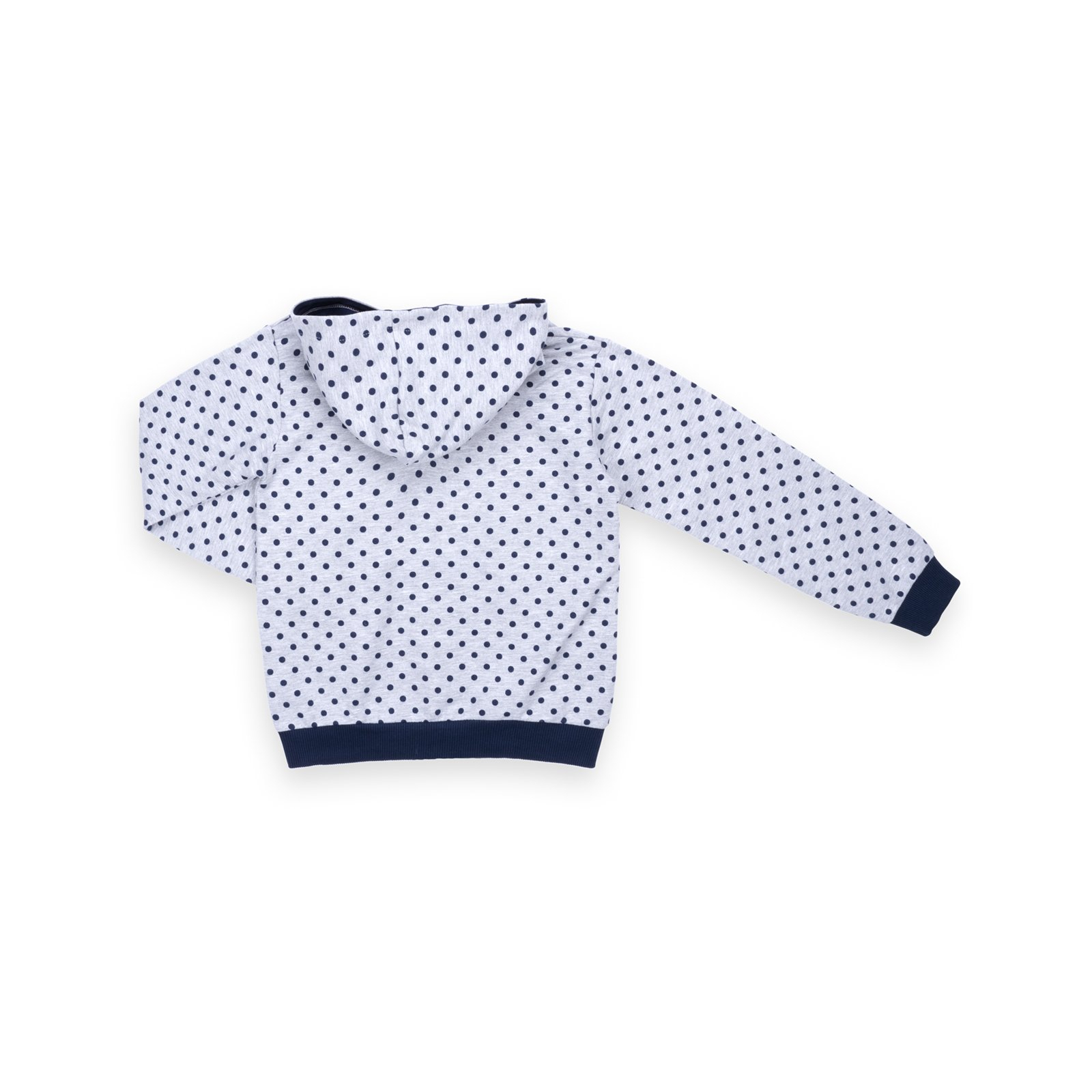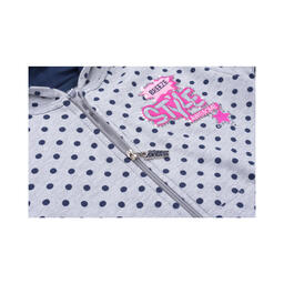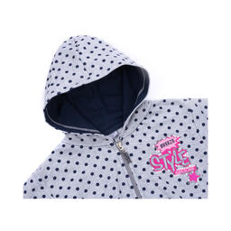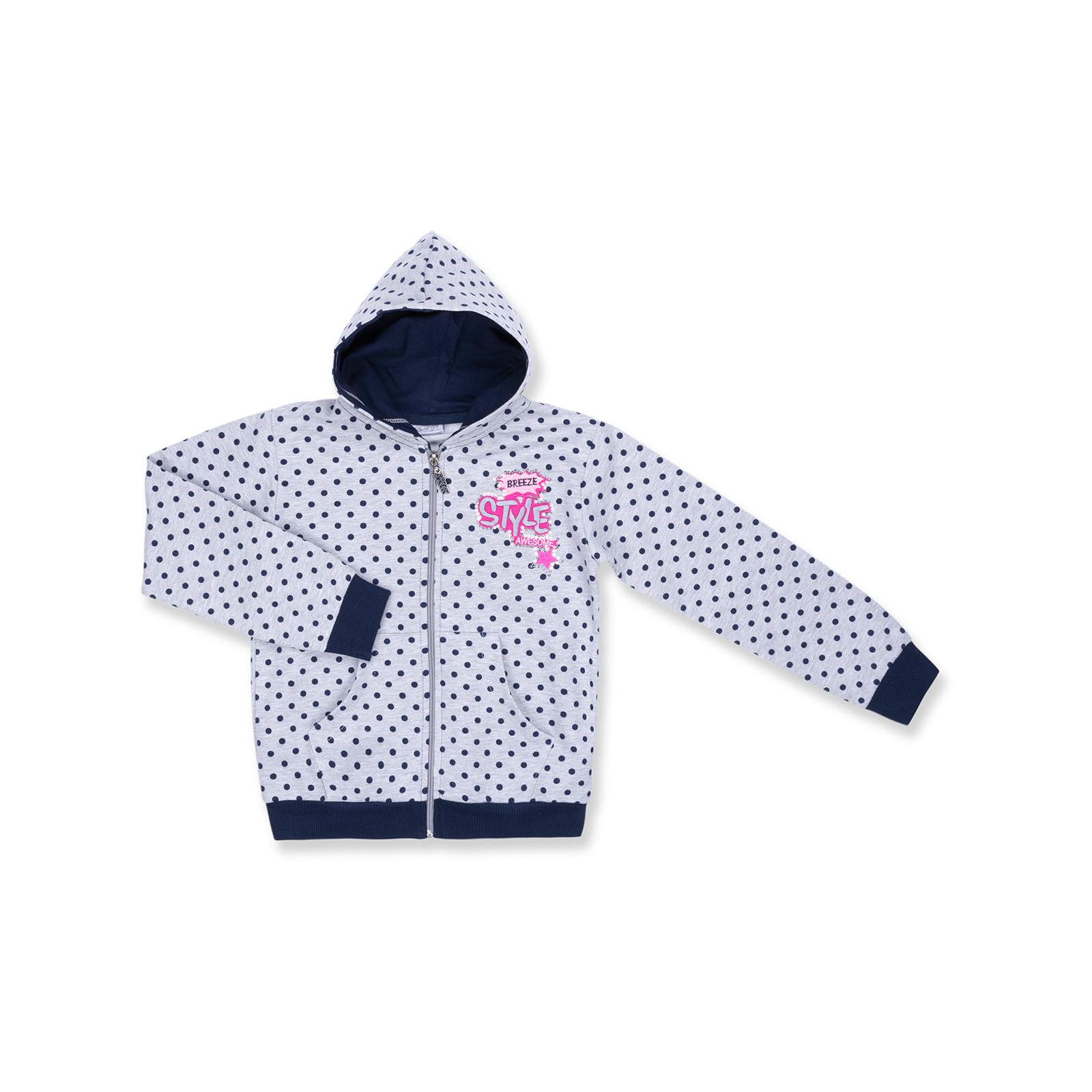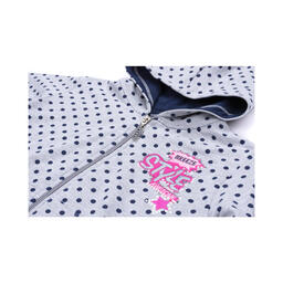 Кофта світло-сіра меланжева в синій горошок, на блискавці, з довгим рукавом і капюшоном. К апюшон подвійний на трикотажній підкладці. Блискавка якісна капронова з фірмовою металевою «собачкою», спереду накладні кишені. Манжети на рукавах та низ олімпійки - з якісної подвійної трикотажної «резинки» синього кольору. Зліва на грудях олімпійка прикрашена стильною вишивкою з пайєтками.
