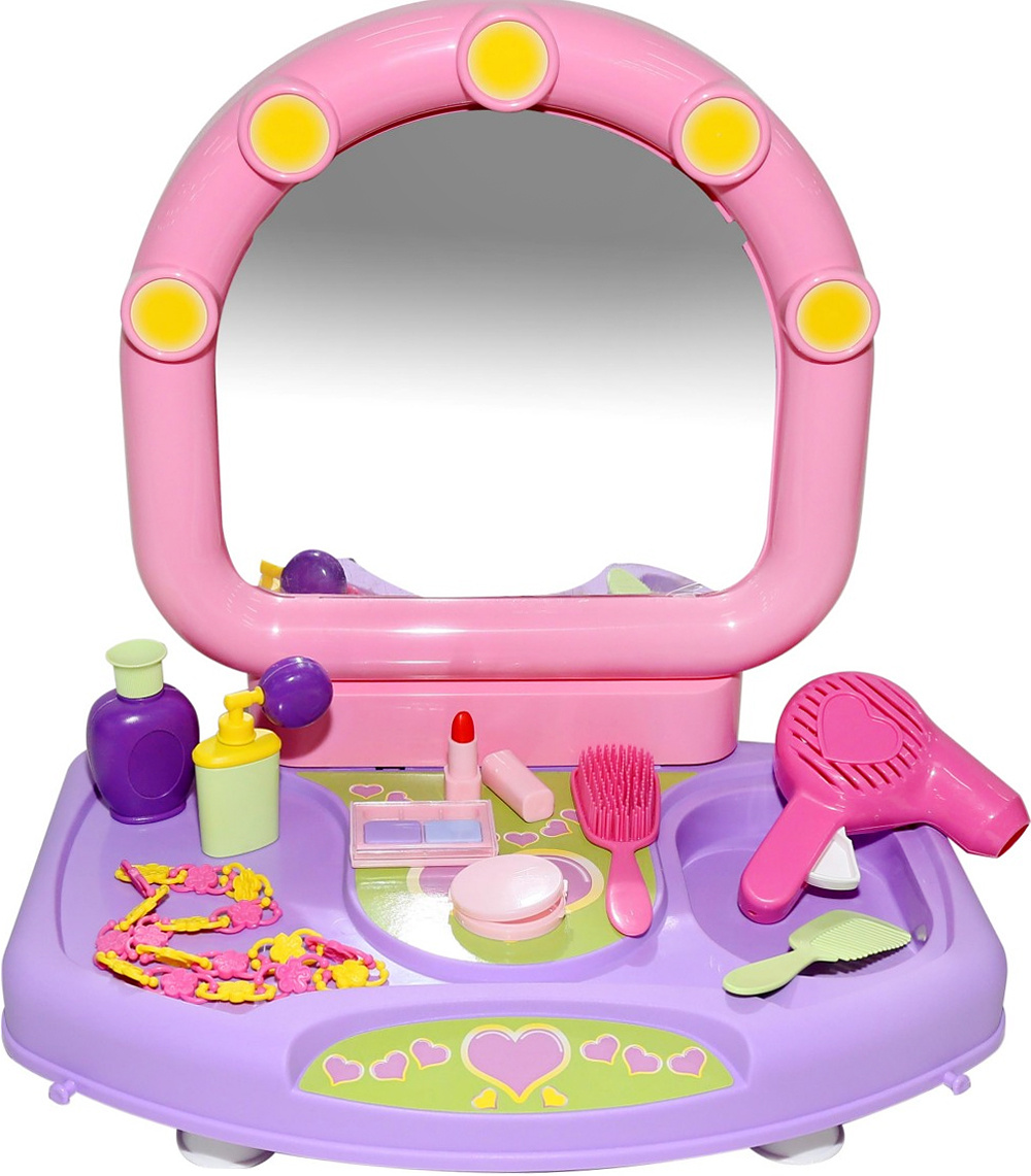 - Комплектация Туалетный столик с зеркалом, фен, 2 расчески, ожерелье, имитация пудры, теней, помады, флакон для духов, бутылочка