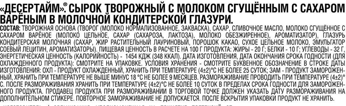 - Состав творожная основа (творог (молоко нормализованное, закваска), сахар, сливочное масло, молоко сгущённое с сахаром варёное (молоко цельное, сахар (сахароза, лактоза), молоко обезжиренное), ароматизатор), глазурь кондитерская молочная (сахар, масло растительное, порошок какао, сухое цельное молоко, эмульгатор соевый лецитин, ароматизатор).