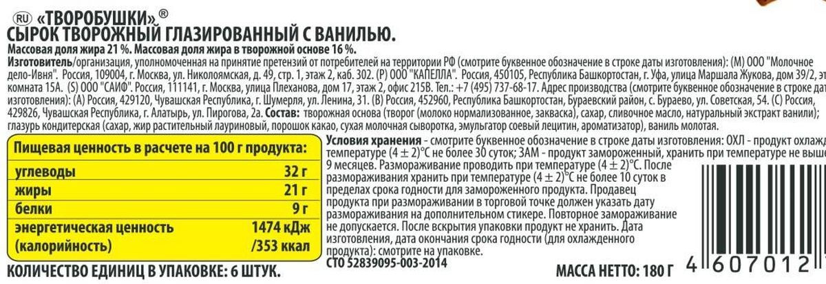- Состав творожная основа (творог (молоко нормализованное, закваска), сахар, сливочное масло, натуральный экстракт ванили); глазурь кондитерская (сахар, жир растительный лауриновый, порошок какао, сухая молочная сыворотка, эмульгатор соевый лецитин, ароматизатор), ваниль молотая