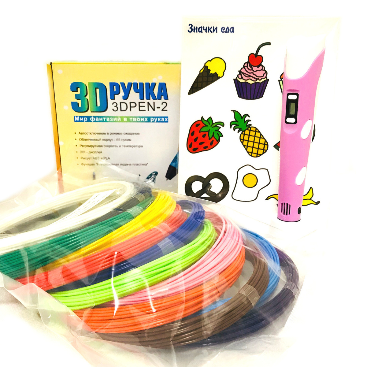 Комплектация1. 3D ручка 3DPEN-2 (цвет: розовый). 2. Набор пластика PLA 12 цветов по 10 метров (120 метров). 3. Набор трафаретов для 3D ручек - 8 листов, 16 многоразовых трафаретов на плотной мелованной бумаге (300 гр/кв.м.) с ламинацией формата A5, для любых 3D ручек и типов пластика.