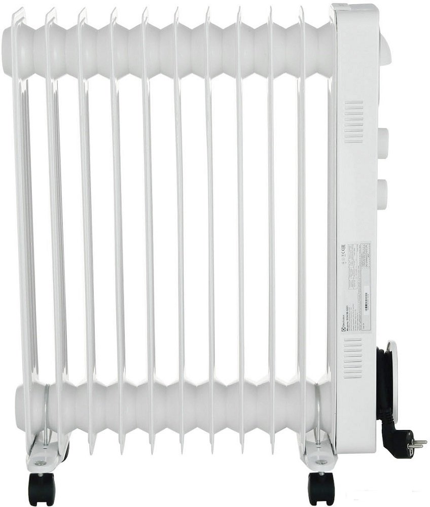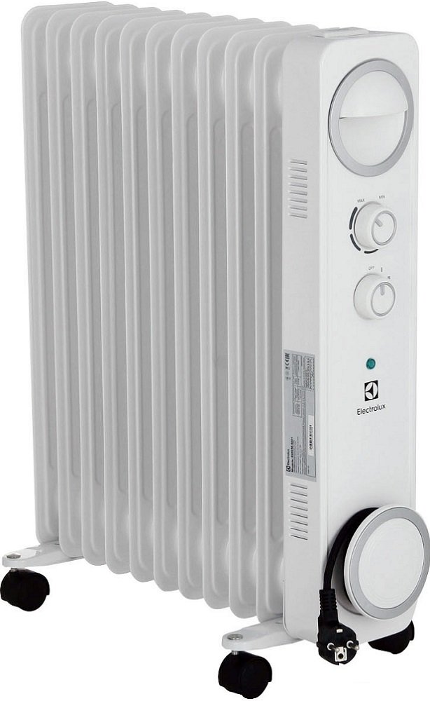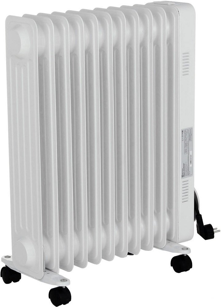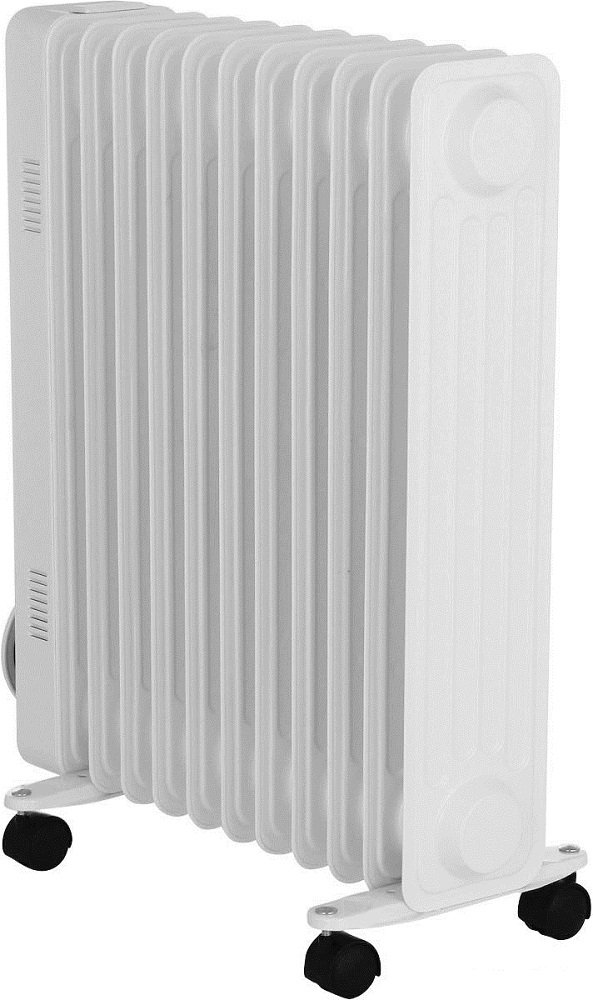 Масляный радиатор, 2200 Вт, термостат, площадь обогрева 27 м2, механическое управление, крепление на стену напольный, отключение при перегреве.