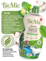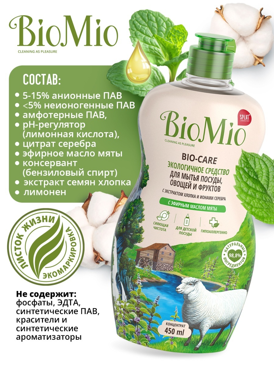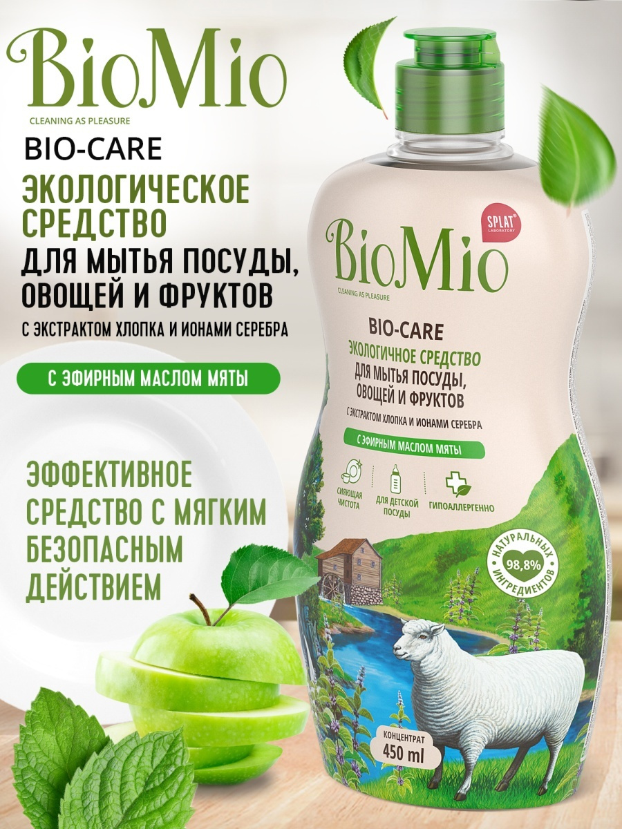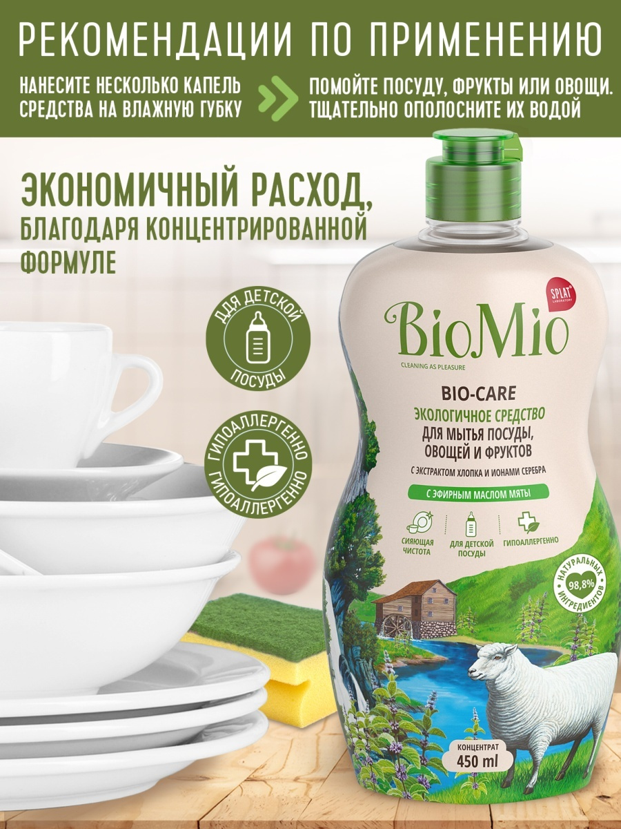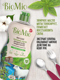 BIOMIO Экологичное средство для мытья посуды, овощей и фруктов BIO-CARE, антибактериальное, с эфирным маслом МЯТЫ, 450 мл