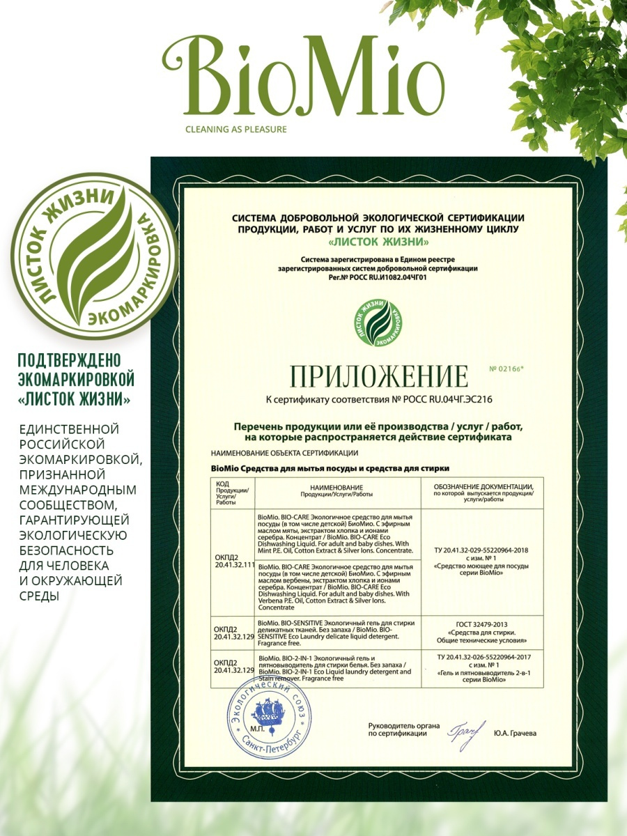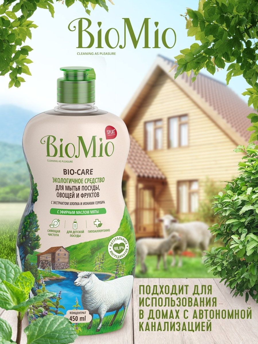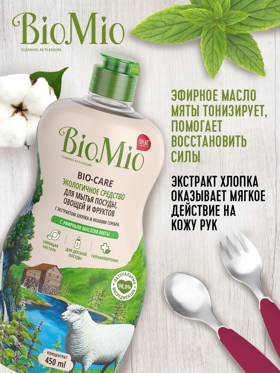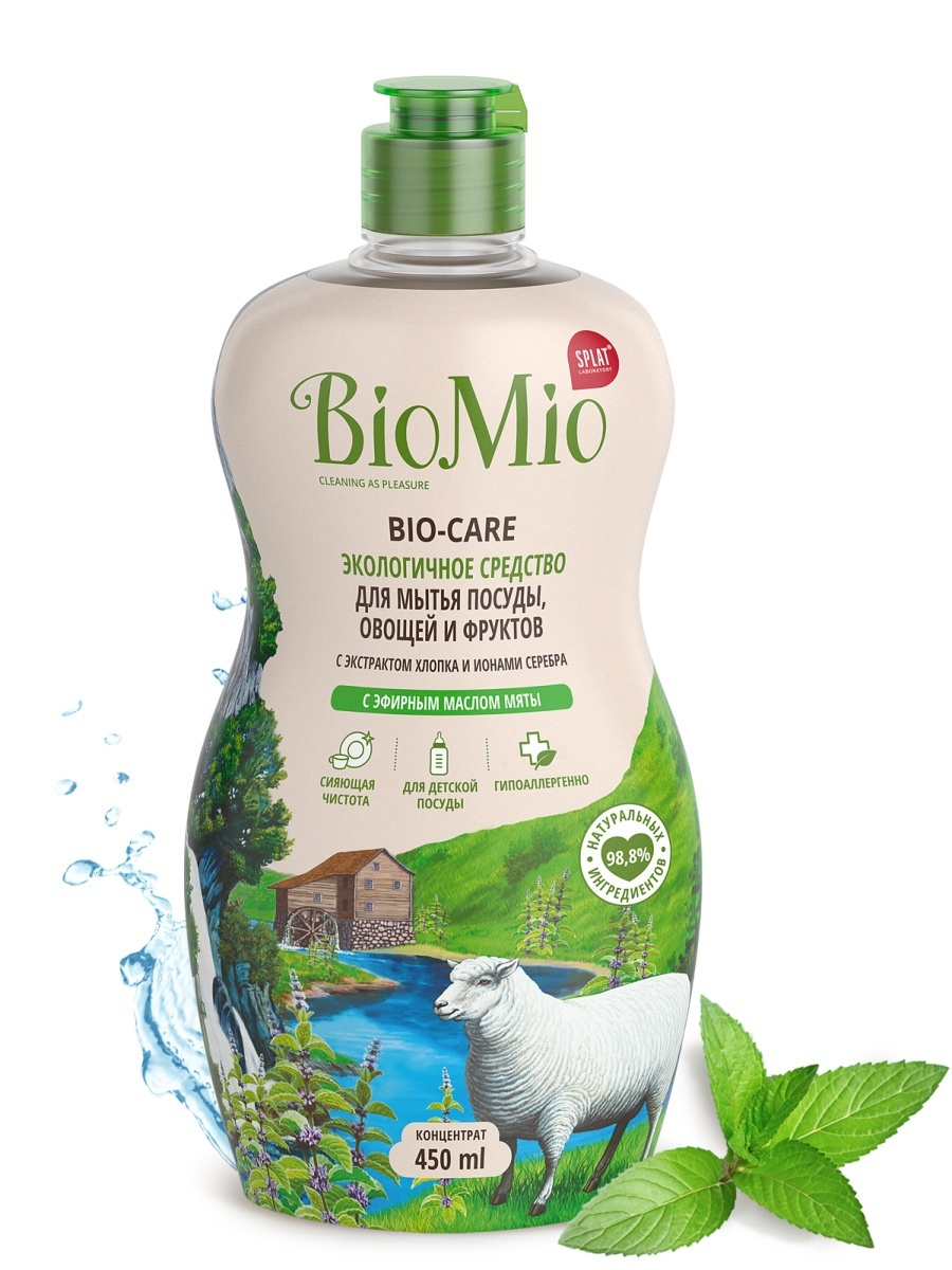 BIOMIO Экологичное средство для мытья посуды, овощей и фруктов BIO-CARE, антибактериальное, с эфирным маслом МЯТЫ, 450 мл